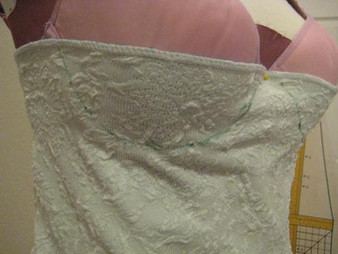 The second section is made of a double layer of cream stretch lace over blue-green jersey knit to capture the depth and color of the design. The lace and jersey layer of fabric is patterned to accommodate for the bust detail.