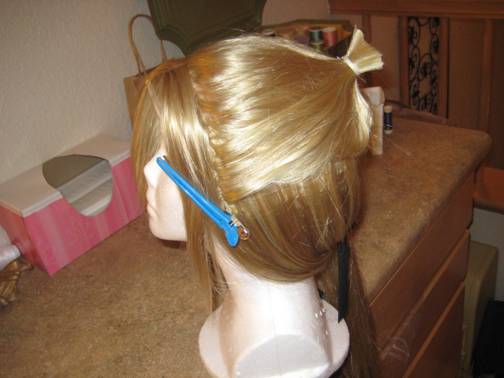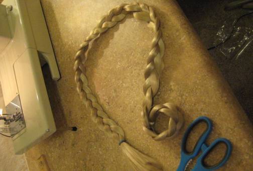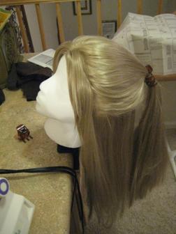 After the extra fiber was installed, the top was stubbed, being tied and then glued into place. A braided bun was made with the remaining loose fiber and also glued to the wig.