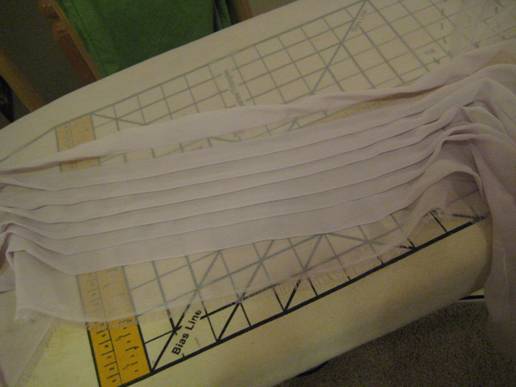 The pleating was accomplished by essentially sewing pintucks into the chiffon with spaces between. The ‘wrong’ side of the pleats were used to hide stitches and to secure the design (pleats are not shown on front to be loose).
