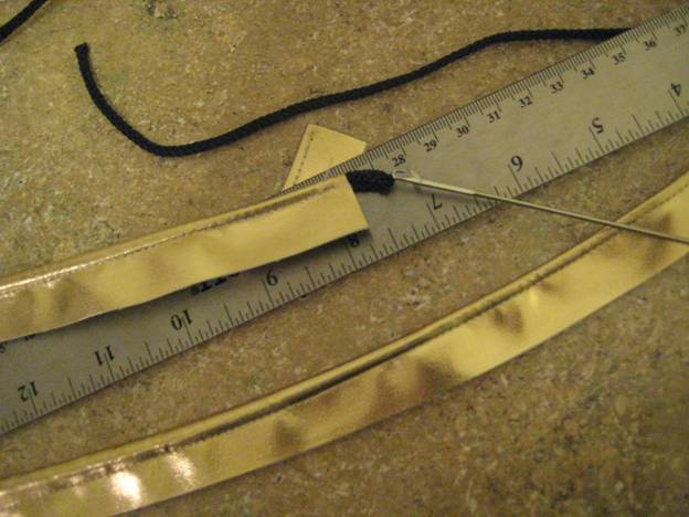 A strip of gold vinyl was sewn with a gradually wider seam, and then ‘stuffed’ with craft woven yarn for dimension.