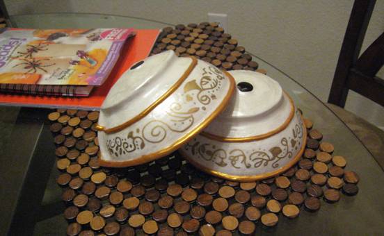 It was then coated on the inside with gunmetal paint. The outside rings were created with computer cord glued into rings, sanded, and painted.