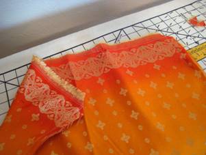 The orange gold cape is synthetic brocade, using the wrong side out. It is trimmed with individual tassles.