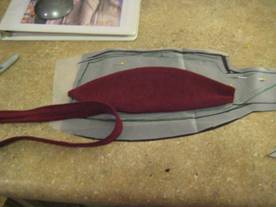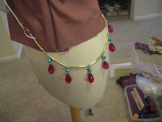 The peach side skirt was pleated and serged to create the appropriate shape and secures under the faux leather belts. This is the only piece that drew any blood in the project: