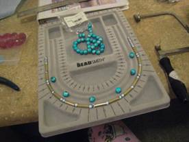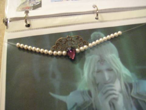 The (almost) finished headband. It is strung on beading wire with oval jump rings attaching the filigree piece. It is held in place with a piece of elastic looped through the ends on the strand.